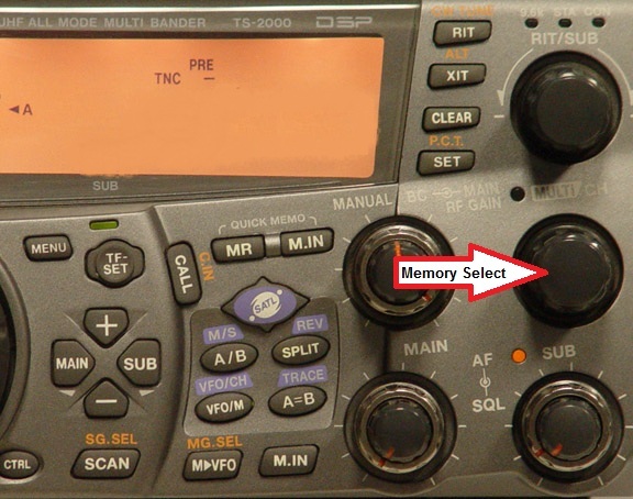 Once in Memory Mode (see above) you will select the appropriate memory channel by turning the Multi/Ch knob on the right hand center side of the radio. Turning this know clockwise will step through the memory channels in increasing order, turning it clockwise will step through the memory channels in decreasing order. As you turn this knob, the main frequency display will change and you will see the cooresponding memory channel displayed below on the main display.