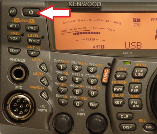 The first step to operating this radio is to power on the TS-2000. The power button is located on the top left of the front panel. Pressing the power button once should turn the radio on. To turn the radio off, press this button again.