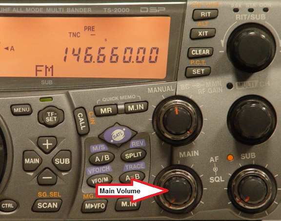 If the radio is in standalone mode (operating by itself with seperate microphone), the main volume can be adjusted by turning the outer dial, titled MAIN as shown.